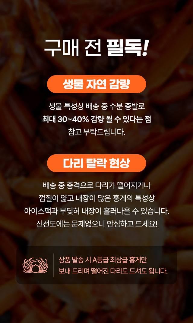 · 자숙 후 30-40%가량 중량 감소되는 점 참고 부탁드립니다.