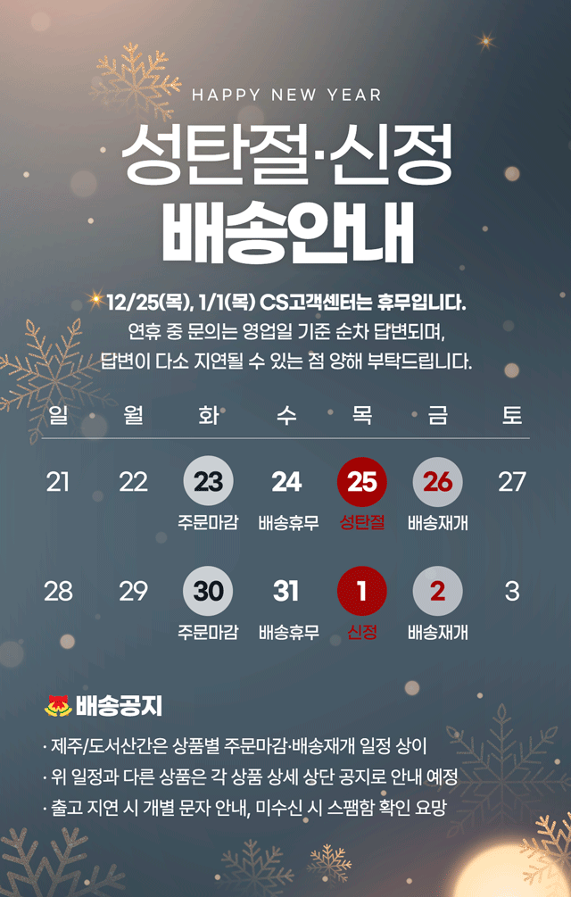 · 평일 주문일 기준 평균 1~3일 내 출고됩니다.(주문폭주 시 개별문자 발송)