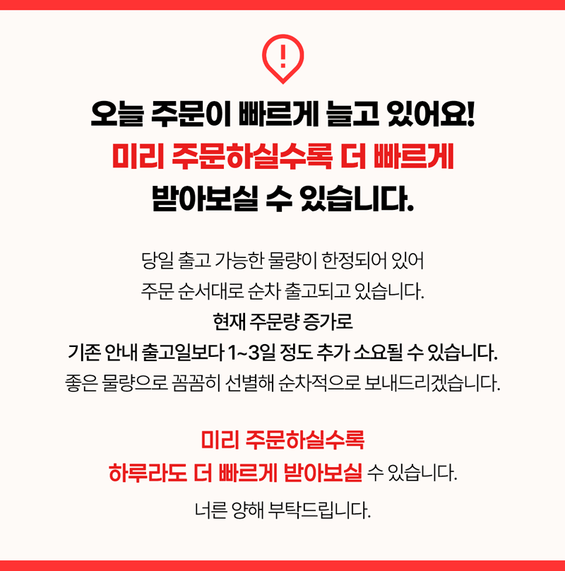· 평일 주문일 기준 평균 1~4일 내 출고됩니다.(입고지연 시 개별문자 발송)