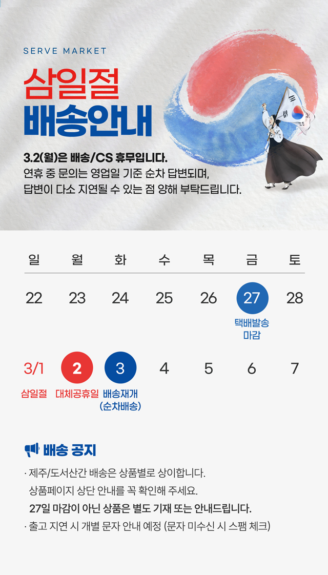 · 평일 주문일 기준 평균 1~3일 내 출고 됩니다.(주문폭주 시 개별문자 발송)