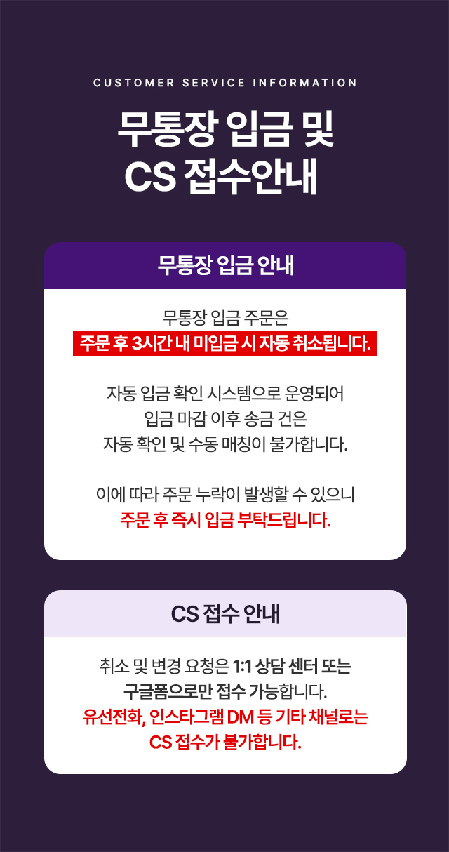 · 평일 주문일 기준 평균 1~3일 내 출고됩니다.(주문폭주 시 지연문자 발송)