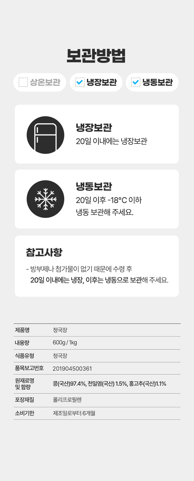 · 방부제 및 첨가물이 없기에 20일 이내는 냉장, 이후는 냉동으로 보관해 주세요.
