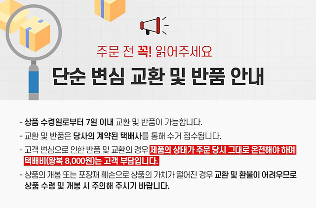 · 배송비 : 4,000원(1개 마다 기본배송비 반복 부과)